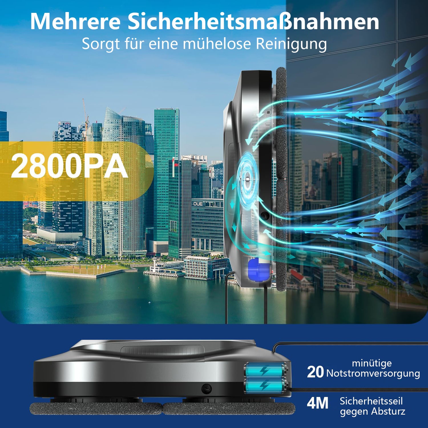 Nutzt eine starke Adsorptionstechnologie, um sicherzustellen, dass es während der Reinigung fest an der Glasoberfläche haftet und nicht abfällt 2800pa-3200pa variable Frequenz-Saugleistung