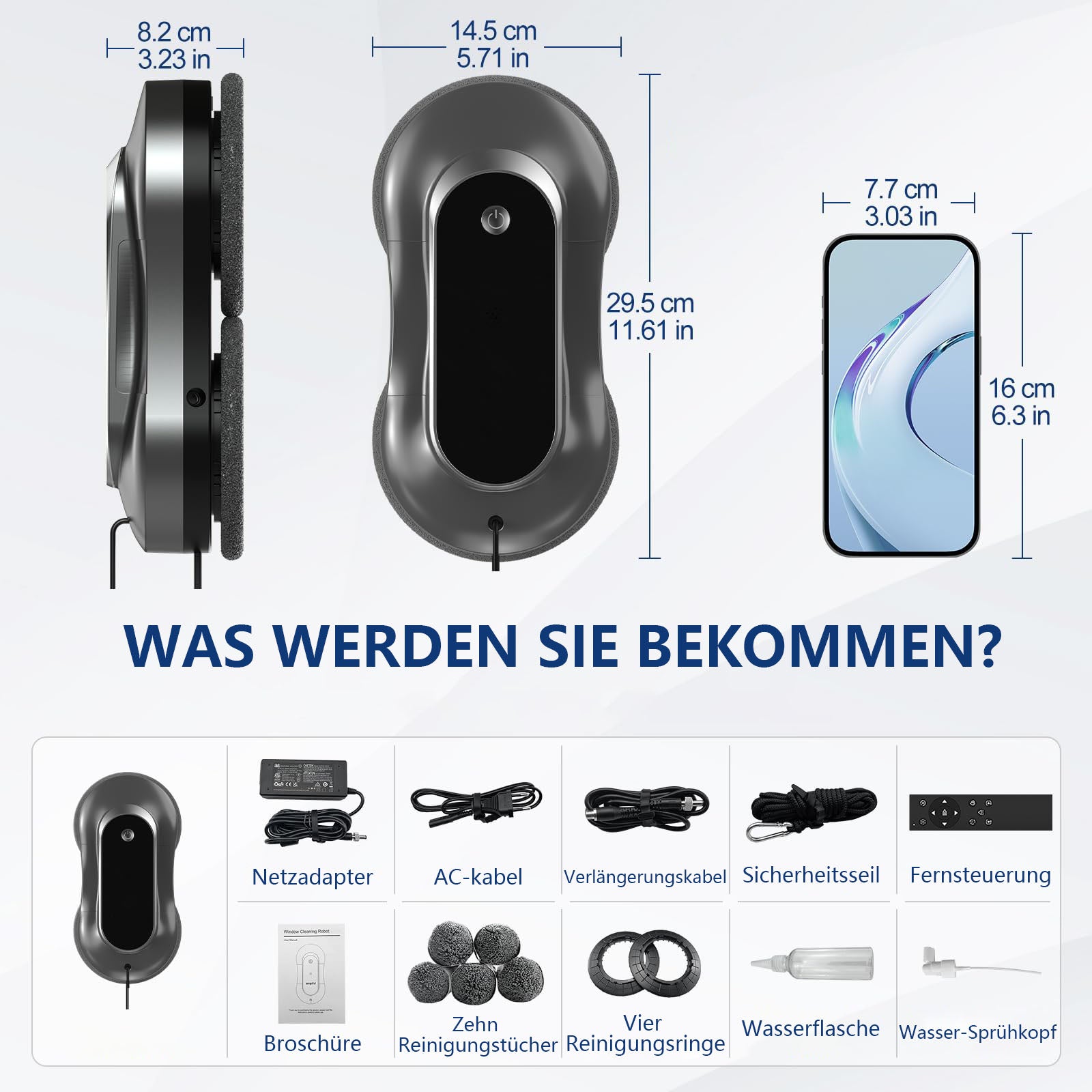 Es verfügt über intelligente Algorithmen, die automatisch Reinigungsrouten planen, um sicherzustellen, dass jeder Teil des Fensters sauber ist.